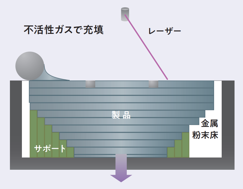 粉末は固まった部分だけが積層され、未固化部分はそのまま残ります。その後、必要に応じて焼結や浸透処理を行い、強度や表面を向上させます。